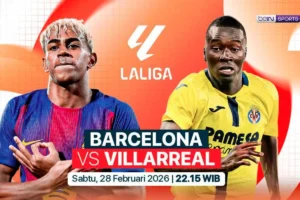 beritanda.com – Barcelona vs Villarreal menjadi laga krusial pekan 26 LaLiga 2026 di Camp Nou, Sabtu 28 Februari pukul 22.15 WIB. Barcelona wajib menang untuk menjaga puncak klasemen dari kejaran Real Madrid. Tuan rumah kini mengoleksi 61 poin, unggul satu angka, dan berpeluang memperlebar jarak menjadi empat poin jika mampu mengamankan tiga angka.